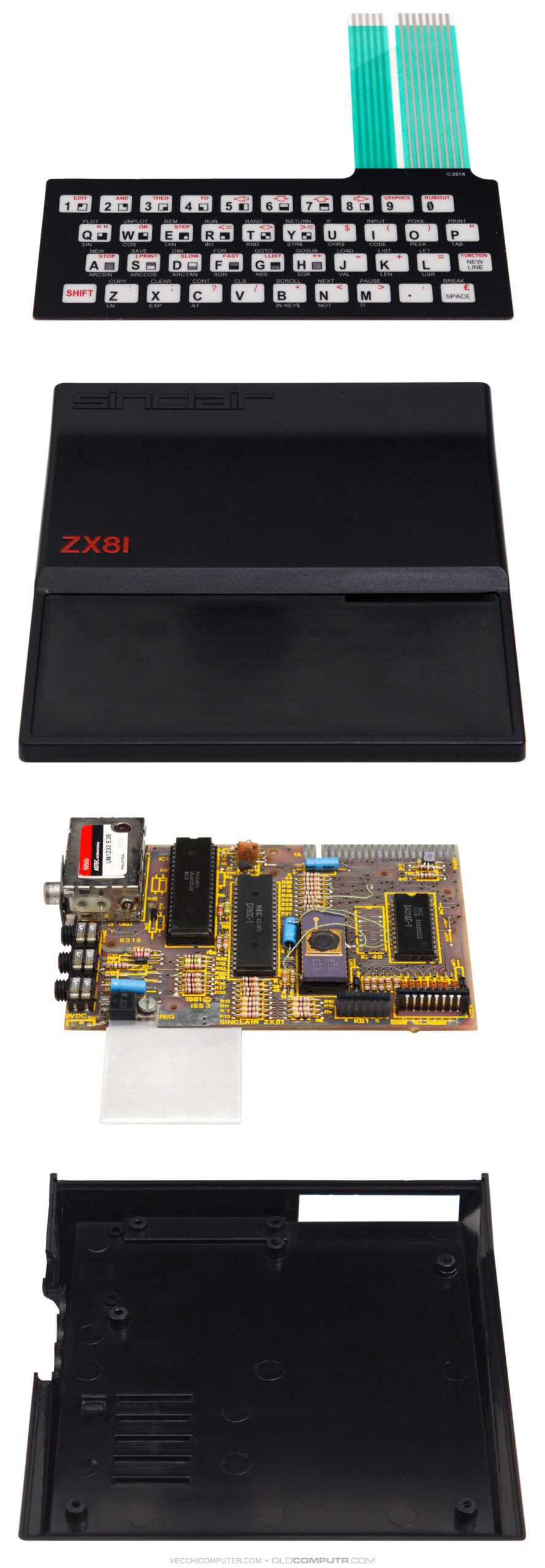 This is an exploded view of the Sinclair ZX81. Three of the five screws that hold the two parts of the case together are located under the rubber feet.